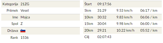 Ne bolijo me noge, sem zadihana, prijetno utrujena. Postavila sem rekord, sicer najpočasnejšega malega maratona ampak tega polmaratona sem res vesela: 2:07:43. Tempo mi je uspelo držati dovolj enakomeren oz. sem ostanek moči lahko porabila proti koncu tekme.