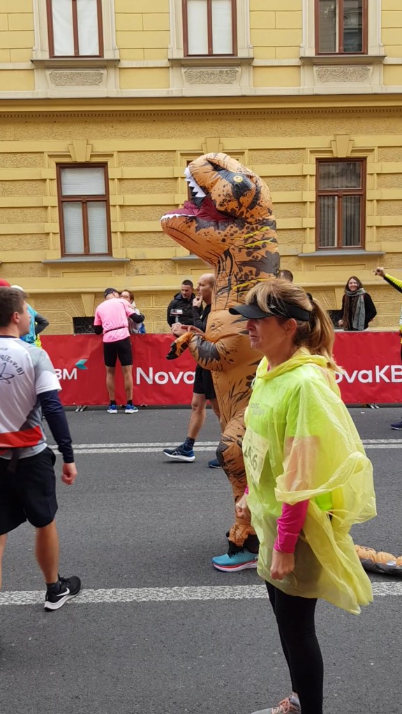 Postavim se čisto na rep. In stopim skoraj dobesedno na rep dinozavru. To pa bo borba, v tej napihljivi preobleki preteči toliko kilometrov. Ampak, zeblo ga ne bo.