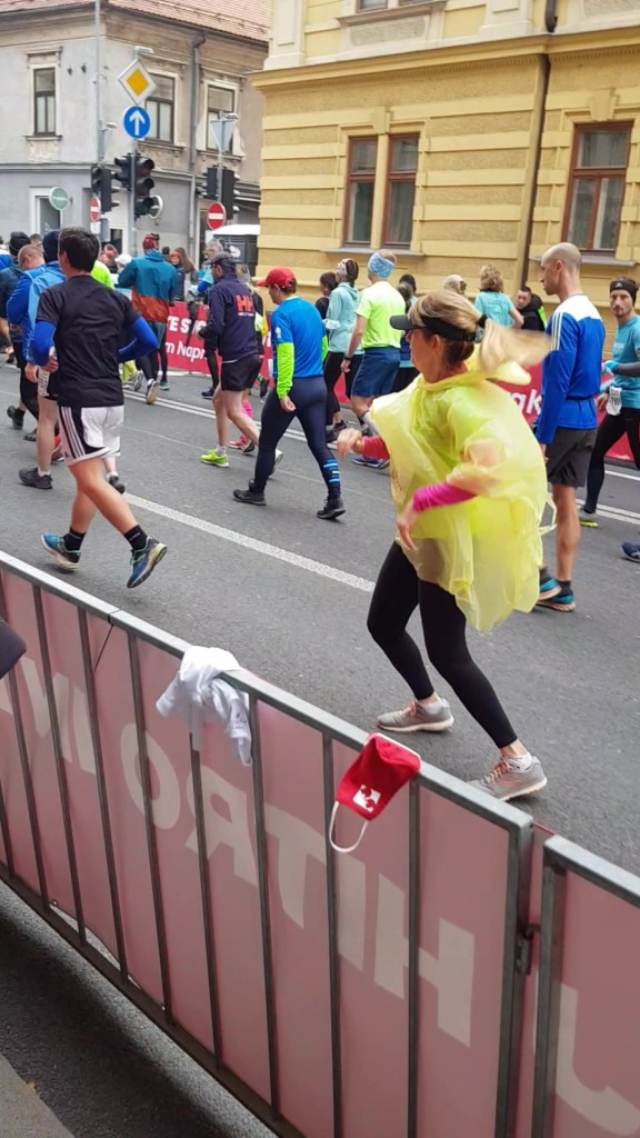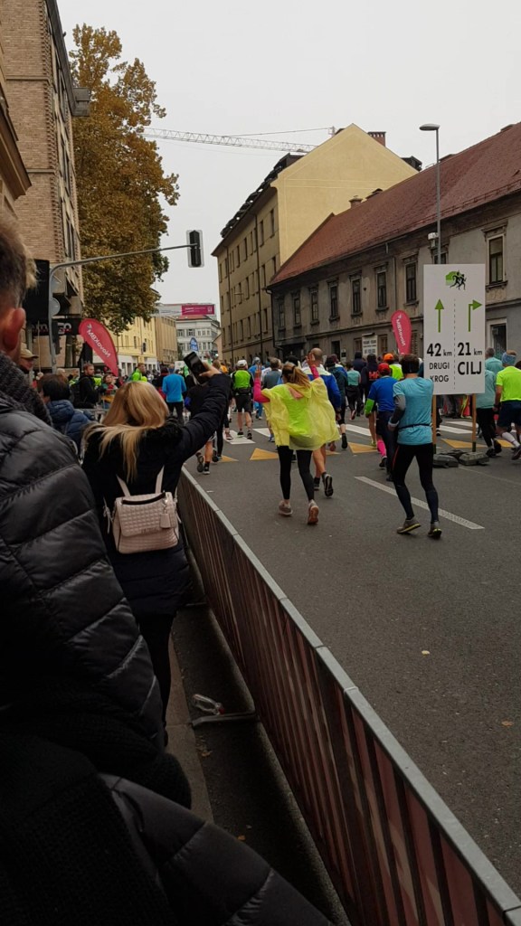 Stroj machine nabija, pomaham jim, tečemo ven iz Ljubljane. Kar precej navijačev, vendar se vidi, da nas je manj. Tečemo proti Stožicam, zaklepetam se s tekačico, ki kar noče nehati govoriti. Gre na maraton, prvi krog mora biti počasnejši, potoži, kako turoben je drugi del maratona, ko ni nikjer nobenega navijača in da se bo morda kar premislila.