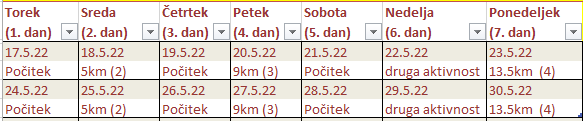 Pa pojdimo konkretno na naš tekaški plan za prva dva tedna tega sklopa. Intenziteta je vpisana kot območje napora ob dolžino treninga. Dolžine posameznih treningov lahko malce prilagodite svojim tekaškim trasam.