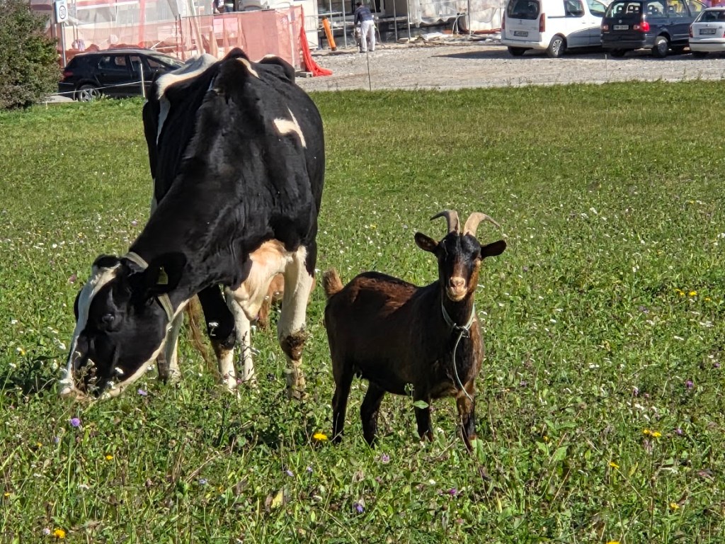 Sledil je spust in ob izstopu iz gozda me je čakalo presenečenje na travniku. Živali! Kravice, bik, kozice.