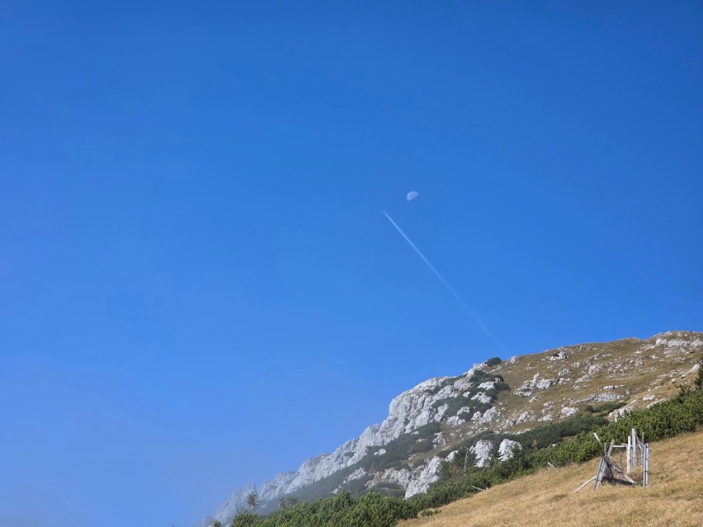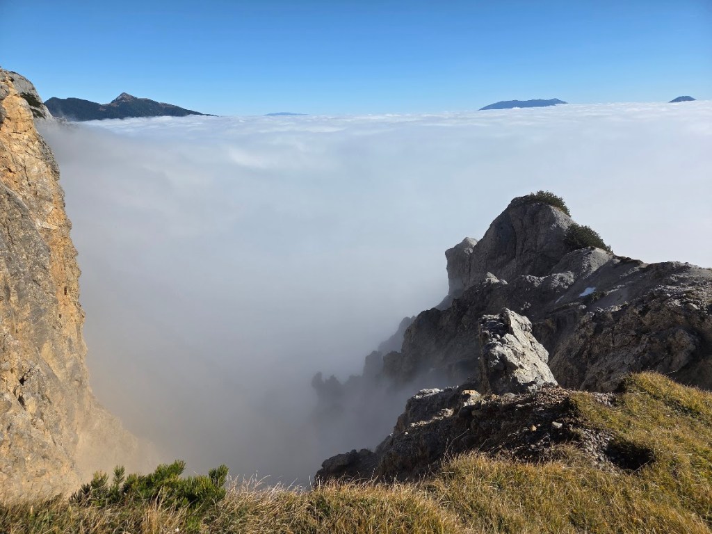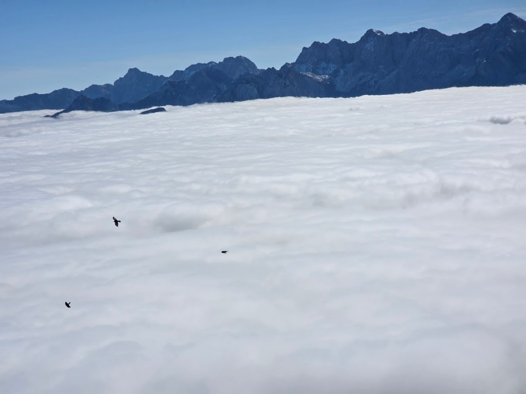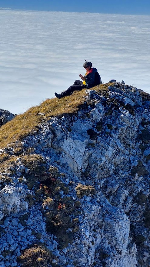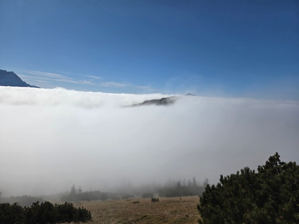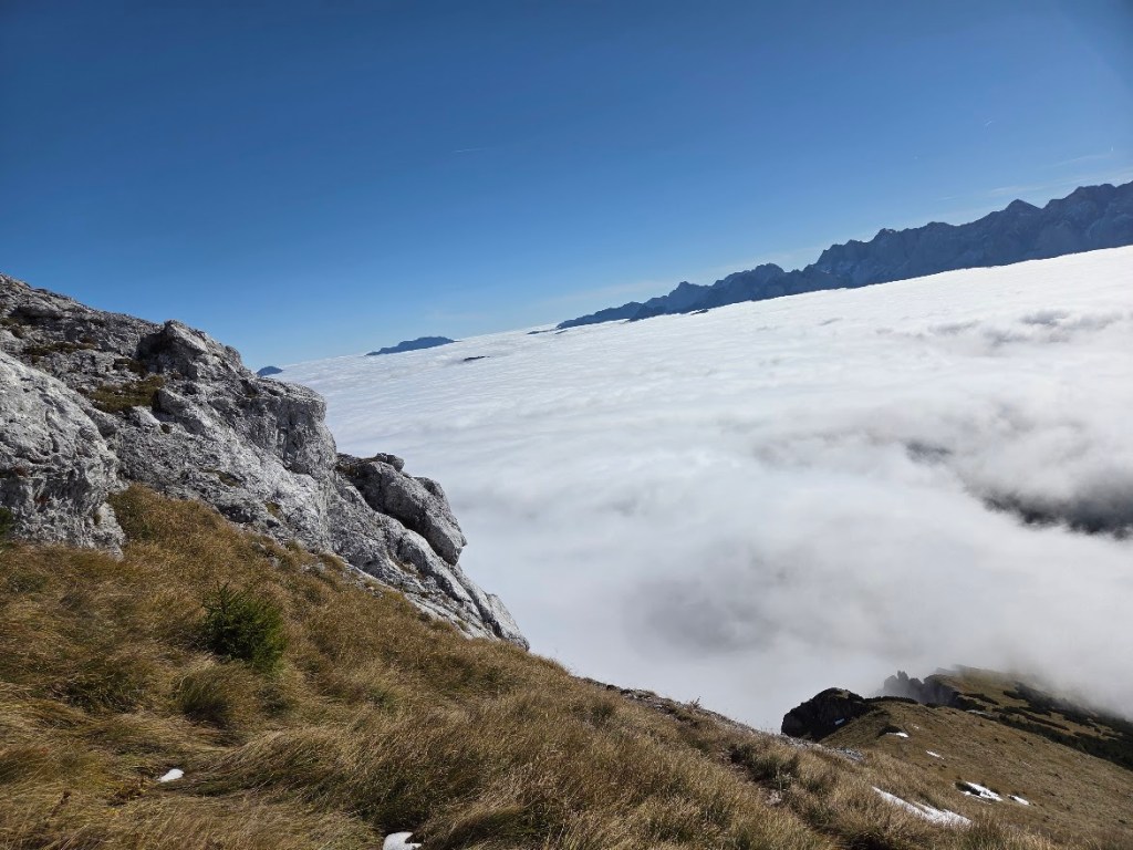 Človek bi se usedel in samo gledal in užival… samo na slovensko stran. Avstrijska je še vedno v megli … le v daljavi se kažejo posamezni vrhovi.