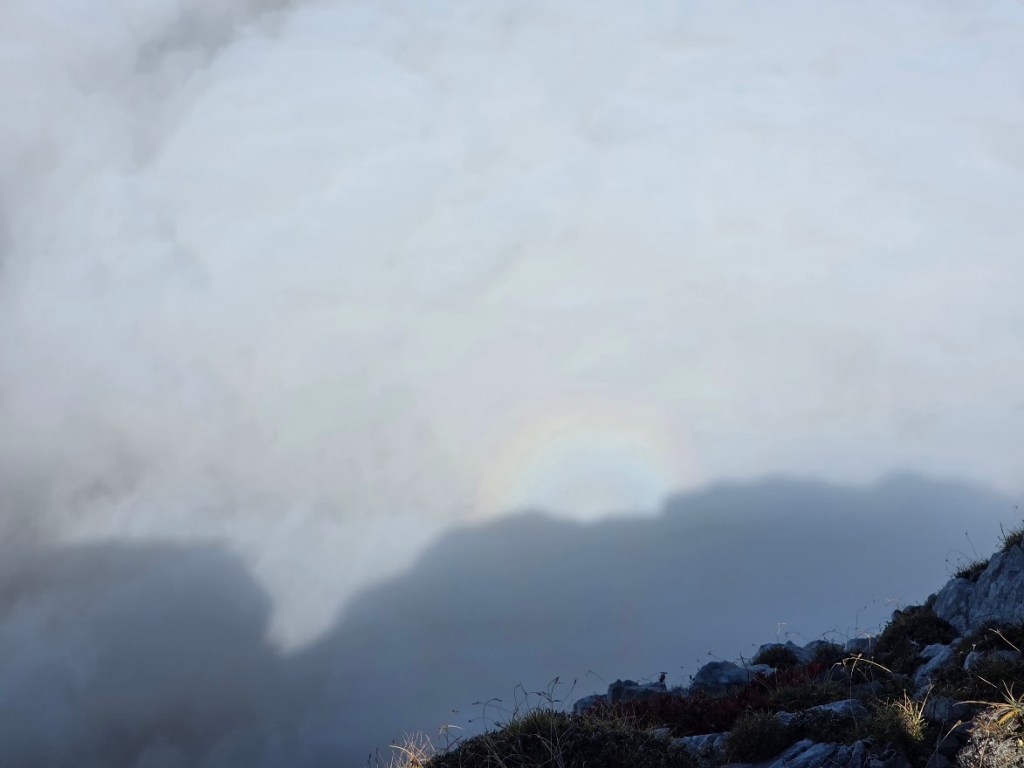 Ob poti zagledava v megli na avstrijski strani glorijo. Tega pojava še nisem videla. Je pa dokaj pogost, kadar je sonce za vami in sije skozi meglo ali oblake. Torej je glorija nekakšna sestrična mavrice, ki nastane po oz. ob dežju.