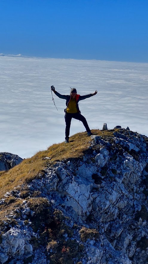 Kreneva naprej po poti, razgled slab, povsod megla, ki postaja vedno gostejša. Ampak midve greva na vrh odločeni, da prebijeva megleno zaveso. Pot je kljub megli dobro vidna, na poti ni večjih nevarnosti in tudi podlaga je relativno suha.